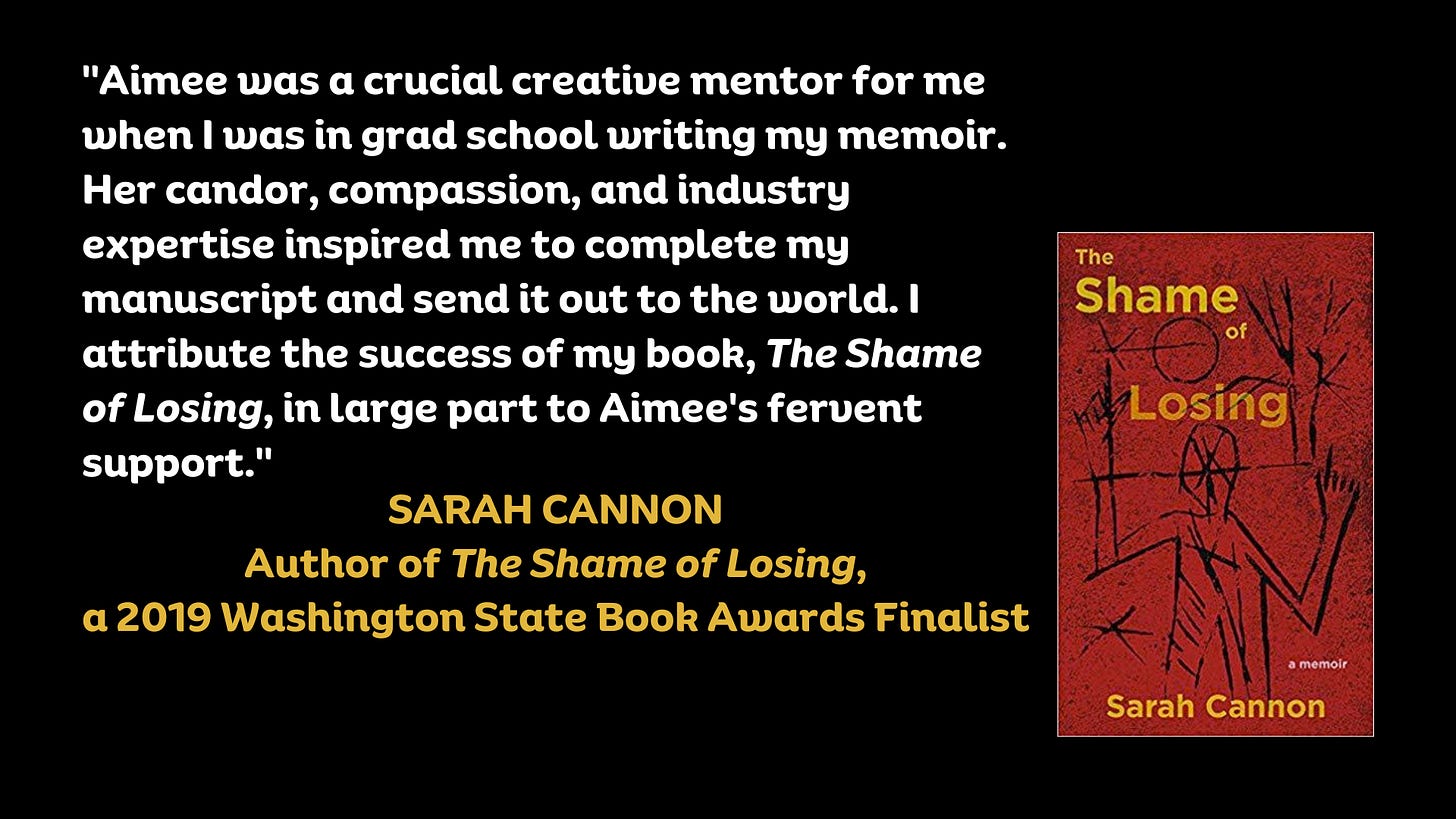 Aimee’s written feedback on both your query and up to 5 pages (1250 words) of creative work, plus an optional follow-up phone call. Your “Take 5 Packet Letter” will highlight both the Strengths and the Opportunities in your work, helping you determine whether it’s time to “press send” to agents or to reorient your revision.