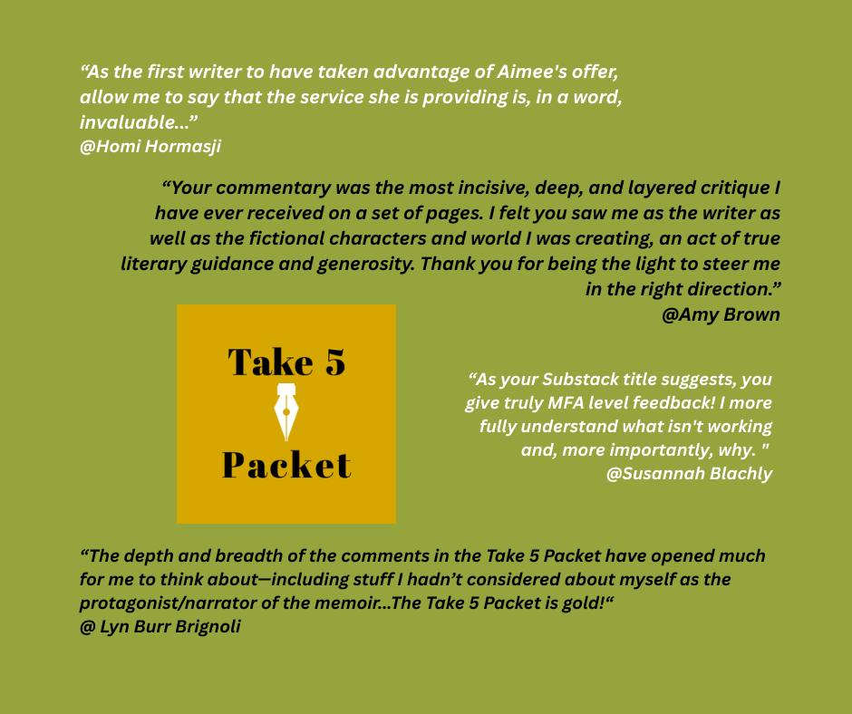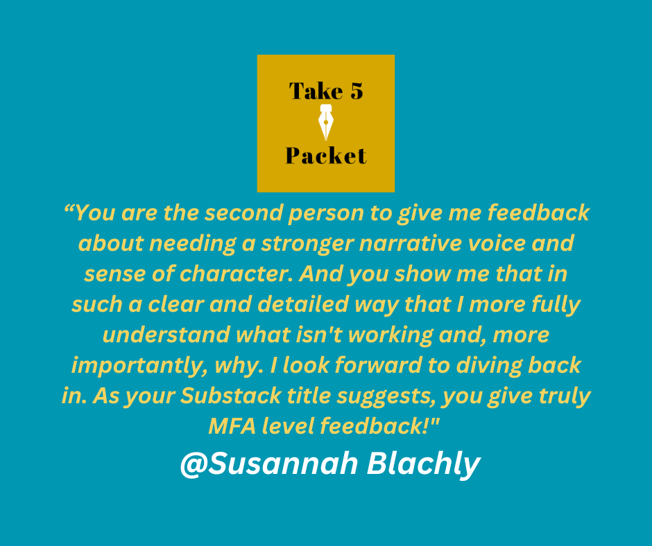 When you become a Premium Member you’re invited to send me a packet consisting of 1-5 pages, or 1250 words, of creative work, plus your query letter/1-page summary of the project and its stage of completion. I will respond with MFA-level feedback in your personal Take 5 Packet, including margin notes and an editorial letter. If you wish, we can also schedule a private follow-up call to discuss your packet.